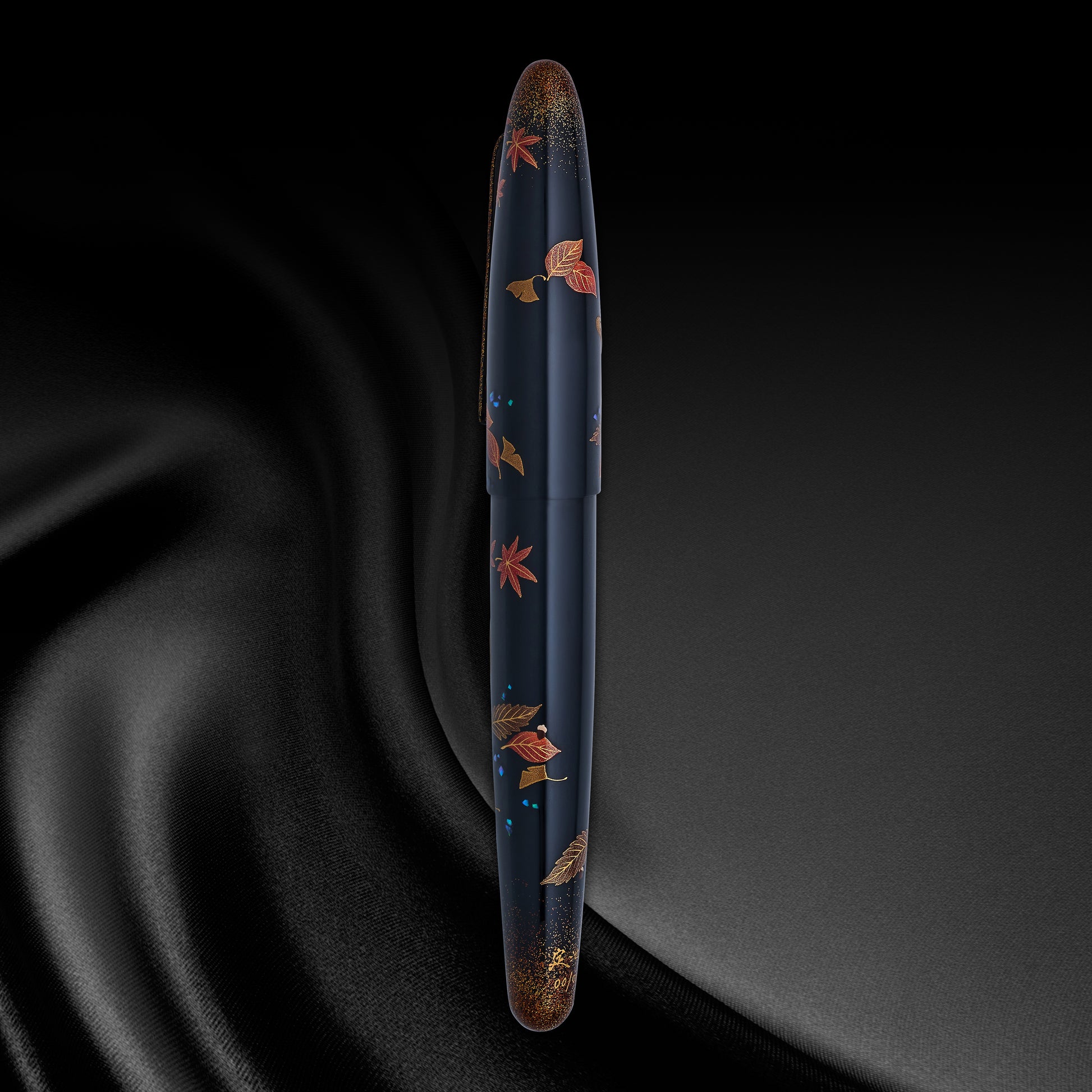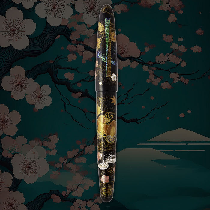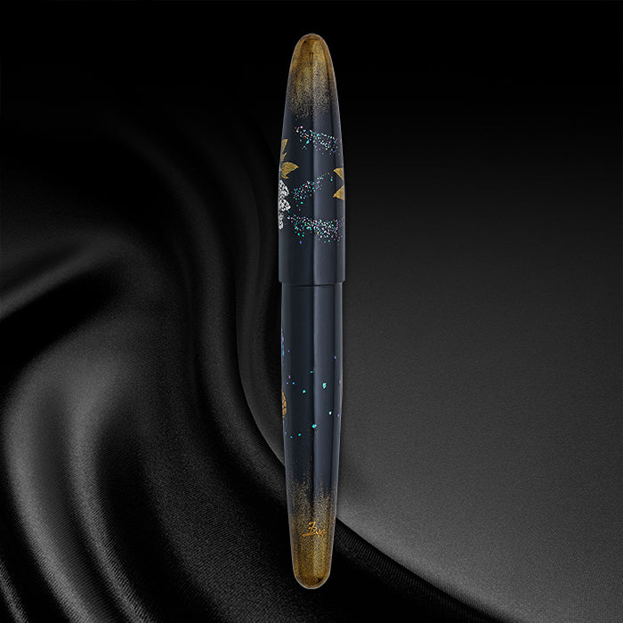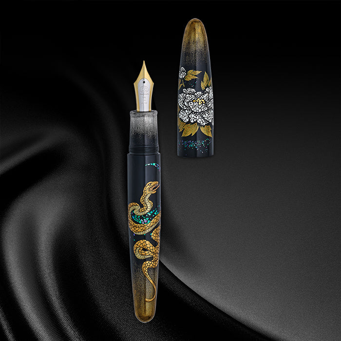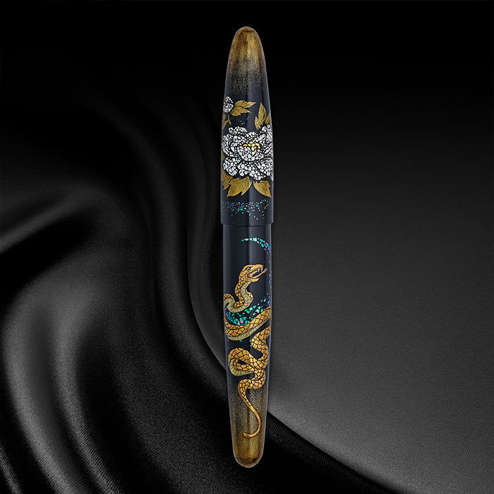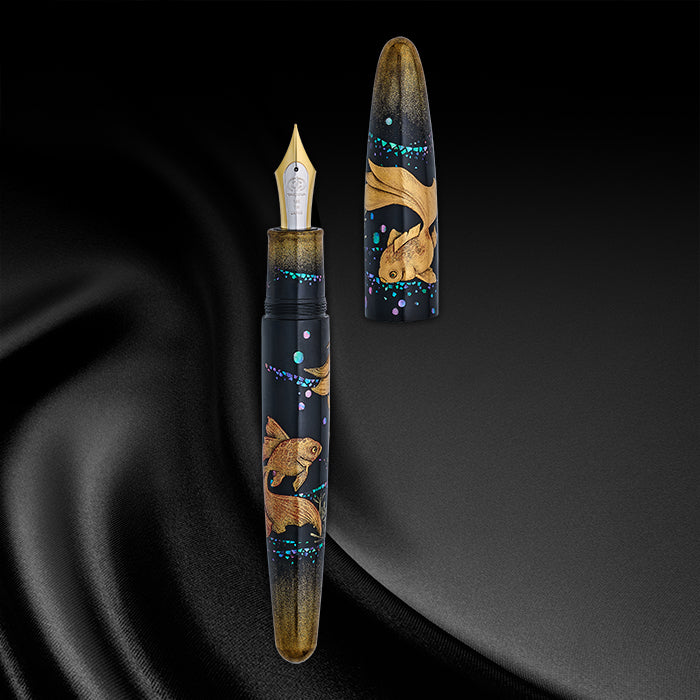 Rankaku, Raden, and Nashiji gold dust techniques are combined with Togidashi-Taka Maki-e to create truly extraordinary pieces of art. The Empress Serpent LE is limited 18 pens and the Empress Goldfish Suaka LE is limited 38 pens worldwide. Each fountain pen is equipped with an exceptional 18K gold two-toned KOP nib.